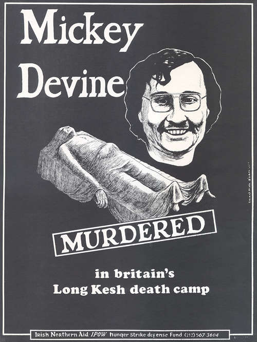 "Mickey Devine Murdered In Britain’s Long Kesh Death Camp" Irish Northern Aid-Irish Prisoners of War Hunger Strike Defense Fund, 1981 Brian Mór Ó Baoigill, artist John McLaughlin Papers AIA Dig. ID 0013PL02 © 2001 ALL RIGHTS RESERVED