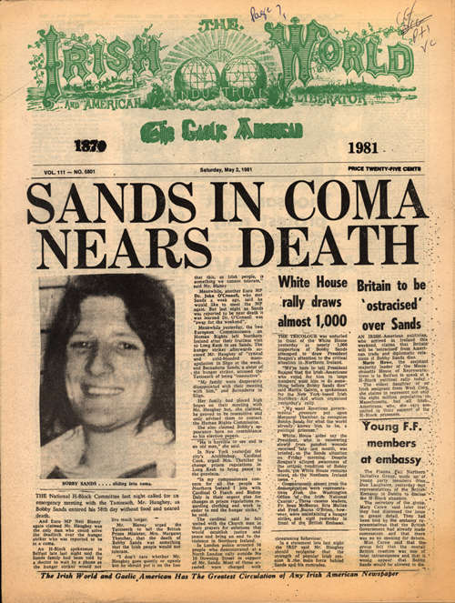 Page 1 headline: "Sands in Coma Near Death" The Irish World and American Industrial Liberator, Gaelic American, 2 May 1981 AIA Dig. ID 0034PL03 © 2001 ALL RIGHTS RESERVED
