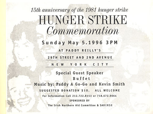 15th Anniversary Hunger Strike Commemoration, New York City Irish Northern Aid & SAOIRSE flyer, 5 May 1996 Irish Republicanism Collection AIA Dig. ID 0038PL02 © 2001 ALL RIGHTS RESERVED