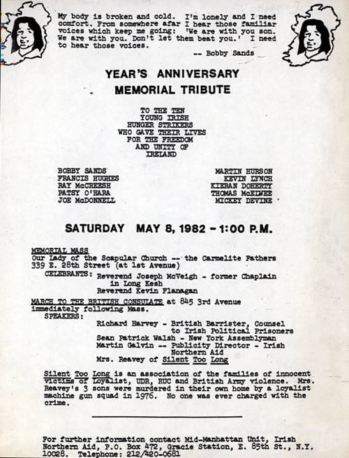 "Year’s Anniversary Memorial Tribute," New York City Irish Northern Aid flyer, 8 May 1982 Irish Republicanism Collection AIA Dig. ID 0039PL02 © 2001 ALL RIGHTS RESERVED