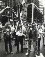 with a sign reading, "Monster Thatcher Wanted for Murder of Irish People"