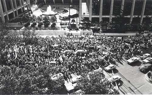 Protest against the visit of the Prince of Wales, Lincoln Center, New York City (aerial), 17 June 1981 Peter Dolan, photographer New York Irish History Roundtable Papers AIA Dig. ID 0006PL01 © 2001 ALL RIGHTS RESERVED