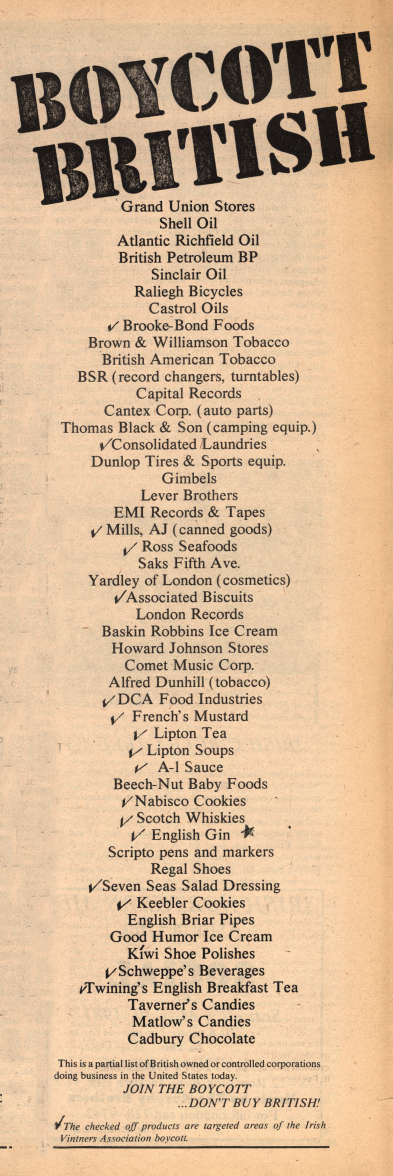 Consumer products on the "Boycott British" list New York, May 1981 The Irish People, 30 May 1981, 4 AIA Dig. ID 0032PL03 © 2001 ALL RIGHTS RESERVED